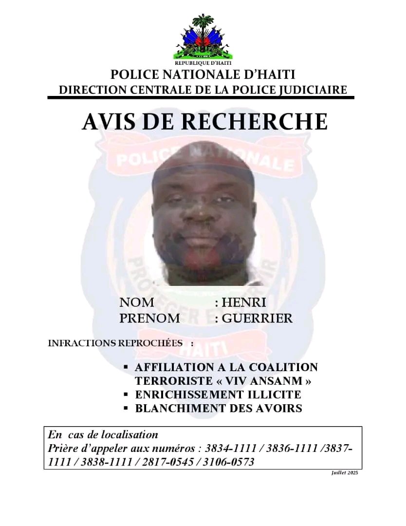 Port-au-Prince, 30 juillet 2025 – La Direction Centrale de la Police Judiciaire (DCPJ), par le biais de la Coordination de la Presse et des Relations Publiques de la DGPNH, a officiellement lancé un avis de recherche contre le journaliste bien connu Guerrier Henri. Selon la note émise, il est recherché pour son implication présumée dans plusieurs actes jugés contraires à la loi.